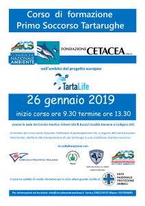 Liste d’attesa, a Codigoro, per il corso di primo soccorso delle tartarughe marine e Aics e Fondazione Cetacea raddoppiano le lezioni. Appuntamento dunque il 26 gennaio e il 9 febbraio, nel Ferrarese, con il percorso formativo organizzato dal Settore ambiente di Aics Emilia Romagna e dalla Fondazione Cetacea, in collaborazione con il Circolo nautico Volano, la Polizia provinciale di Ferrara, il comparto marittimo del Corpo dei vigili giurati. L’appuntamento, nell’ambito del progetto europeo TartaLife, è dalle 9.30 nella sede del Circolo nautico Volano (via Buozzi, a Codigoro). Il corso ha validità di credito formativo per il corso allievi guardie zoofile dell’Ente nazionale di protezione animali. Per informazioni e iscrizioni, info@circolonauticovolano.it.
