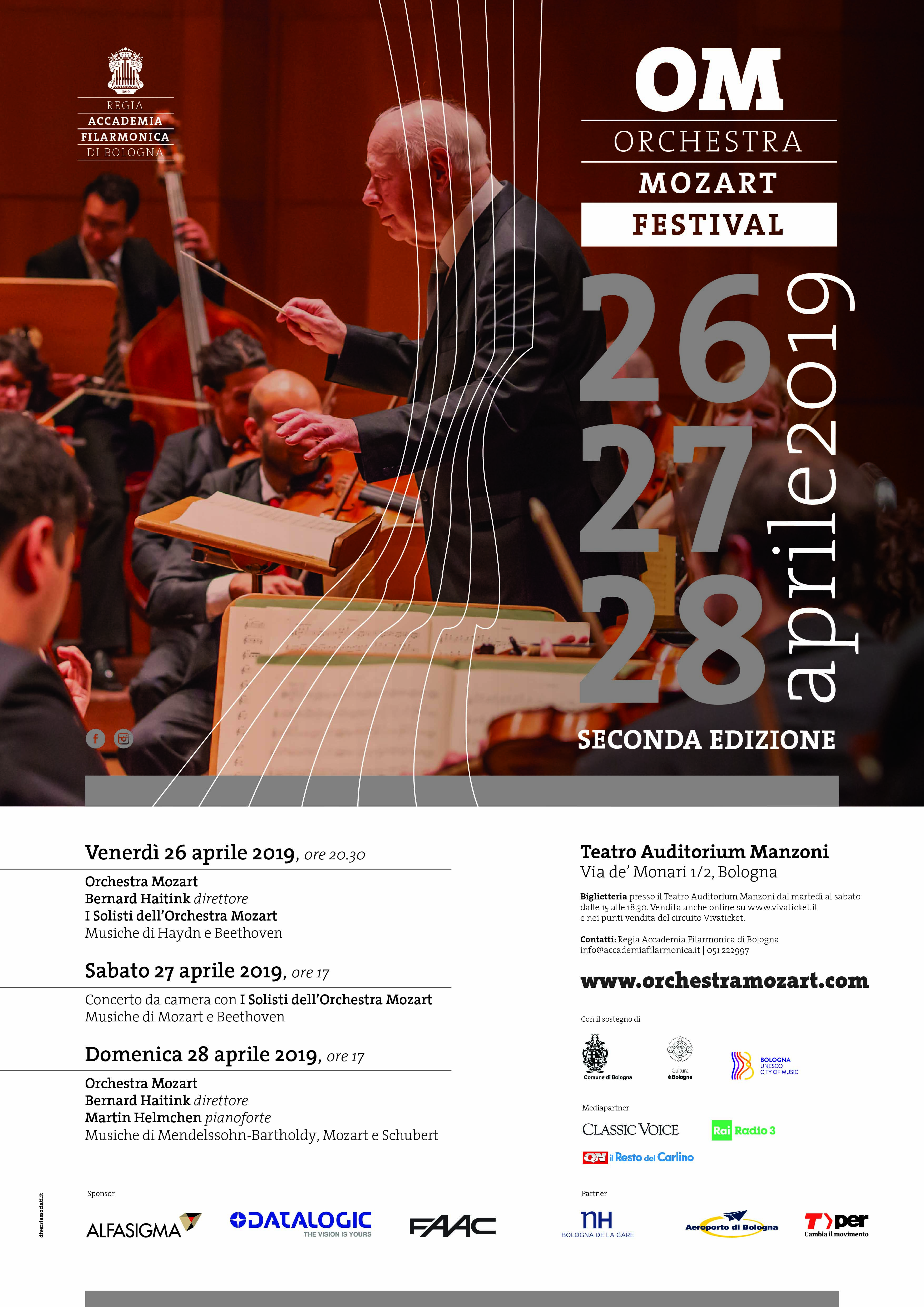 L’Accademia Filarmonica di Bologna è lieta di presentare la seconda edizione dell’Orchestra Mozart Festival che si terrà quest’anno dal 26 al 28 aprile a Bologna. Costituita da musicisti provenienti dall’Italia e da tutto il mondo, l’Orchestra Mozart suonerà per due concerti sinfonici e uno da camera al Teatro Auditorium Manzoni, diretti ancora una volta dal grande Maestro Bernard Haitink e con la partecipazione del pianista Martin Helmchen. Riduzione del 15% per le associazioni convenzionate, tra cui Aics.