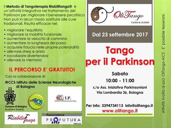 A Bologna parte il progetto ““Tango per il Parkinson: percorso di Tango per persone con malattia del Parkinson“, di cui Asd OliTango è capofila. 14 incontri gratuiti di Tango Argentino nei quali verrà utilizzato il Metodo di Tangoterapia Riabilitango®, un’attività fisica coadiuvante nel trattamento del Parkinson, che utilizza esercizi specifici selezionati accuratamente dai passi del tango argentino e musiche di tango argentino per migliorare il benessere psico-fisico. L’attività è da considerarsi integrativa rispetto alle cure tradizionali, non può in alcun modo sostituirle.