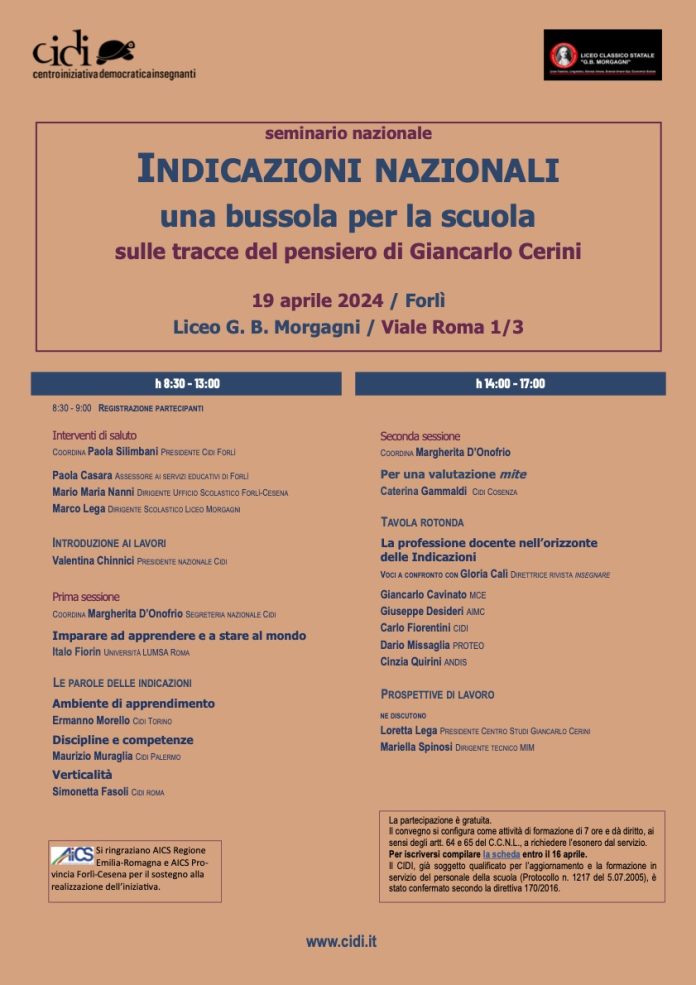 Venerdì 19 aprile 2024, presso il liceo “G. B. Morgagni” di Forlì, avrà luogo il seminario nazionale CIDI (Centro Iniziativa Democratica Insegnanti), organizzato in collaborazione con AICS Emilia Romagna e AICS Forlì-Cesena.