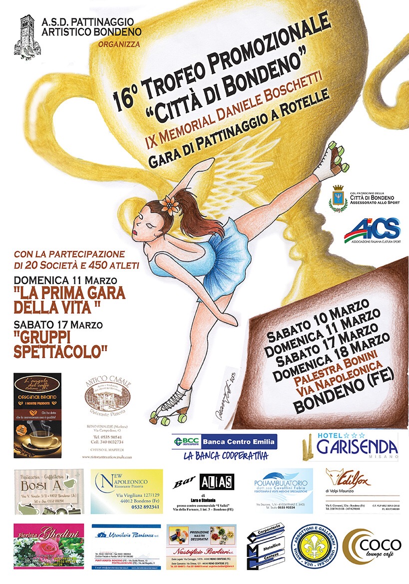 Per gli amanti del Pattinaggio Artistico a Rotelle sabato 10 e domenica 11 marzo, poi sabato 17 e domenica 18 marzo, presso il Palasport Comunale Bonini, in Via Napoleonica n° 87 a Bondeno di Ferrara, si terrà il “16° Trofeo Città di Bondeno – IX Memorial Daniele Boschetti”, organizzato come tutti gli anni dall’Associazione Sportiva Dilettantistica Pattinaggio Artistico Bondeno in collaborazione con l’AICS e patrocinato dal Comune di Bondeno di Ferrara.