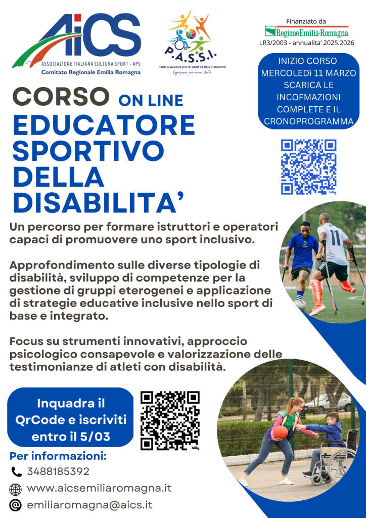 Il corso, gratuito, della durata di 15 ore online (11–30 marzo), approfondisce le diverse tipologie di disabilità (cognitivo-relazionale, fisico-motoria, sensoriale), l’evoluzione culturale dell’inclusione nello sport e propone strumenti metodologici innovativi come sport integrato, metodologia obliqua e strategie musicali applicate all’attività sportiva.