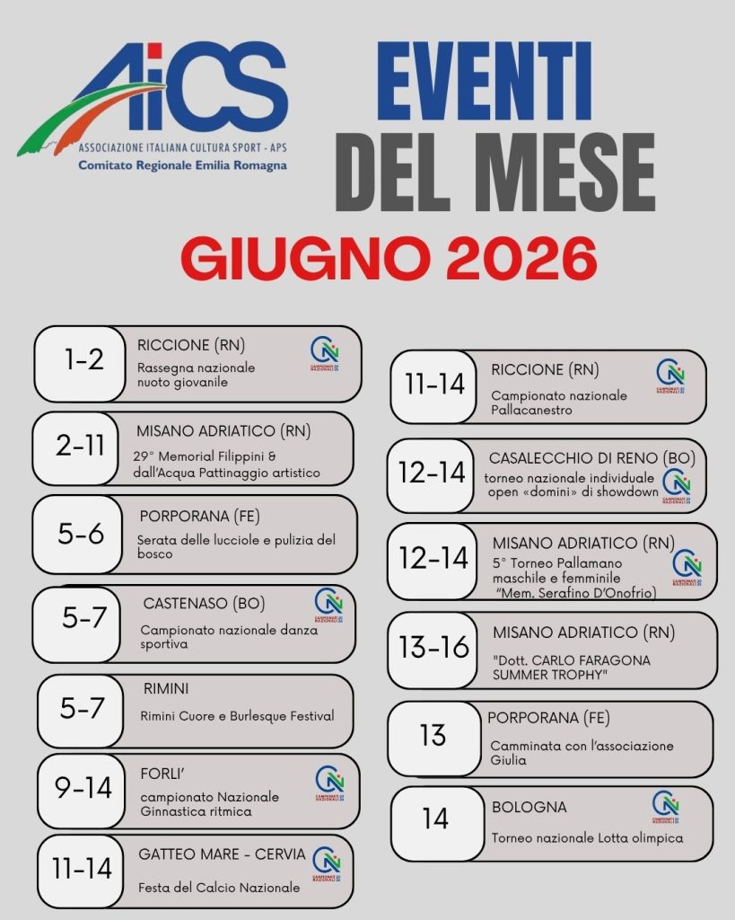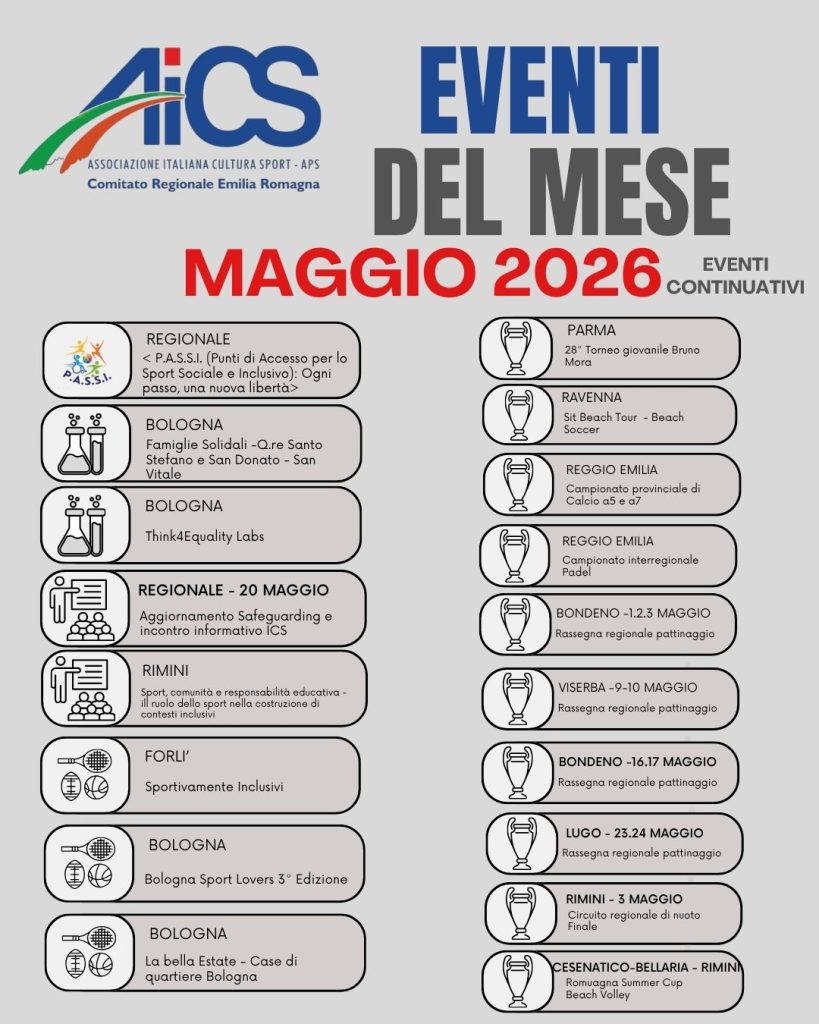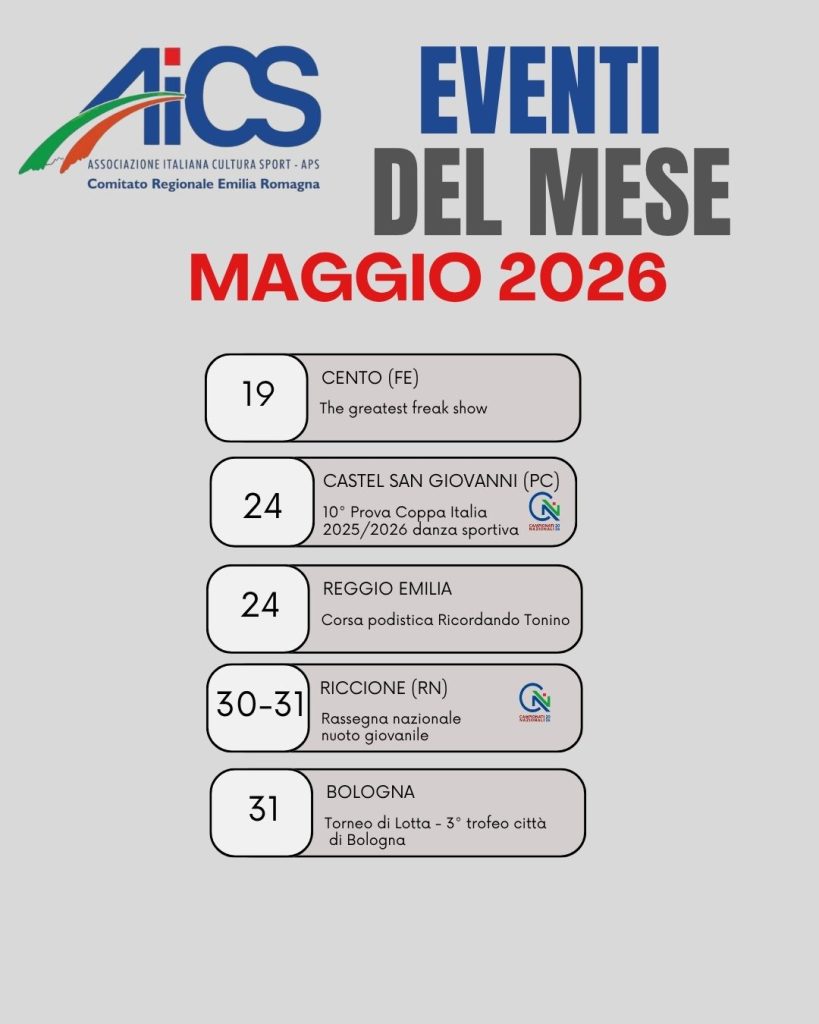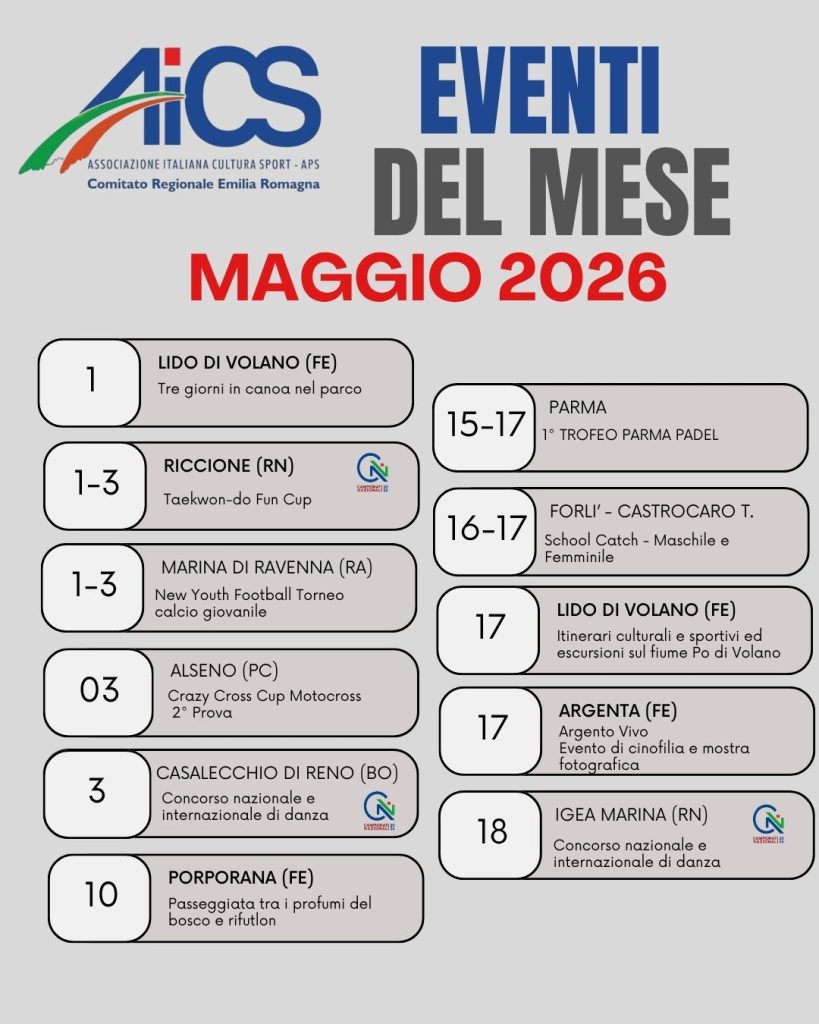 Dopo un primo quadrimestre ricco di successi, prosegue la programmazione AiCS Emilia-Romagna con la pubblicazione della seconda parte del Calendario Eventi 2026. Un nuovo capitolo fatto di iniziative che valorizzano lo sport, il territorio e la partecipazione della comunità.