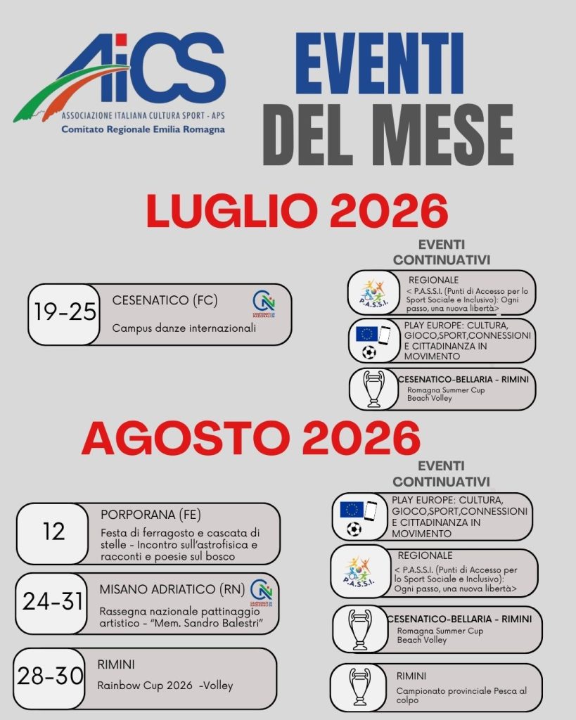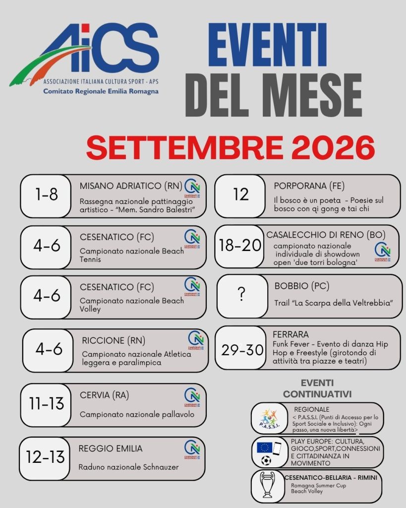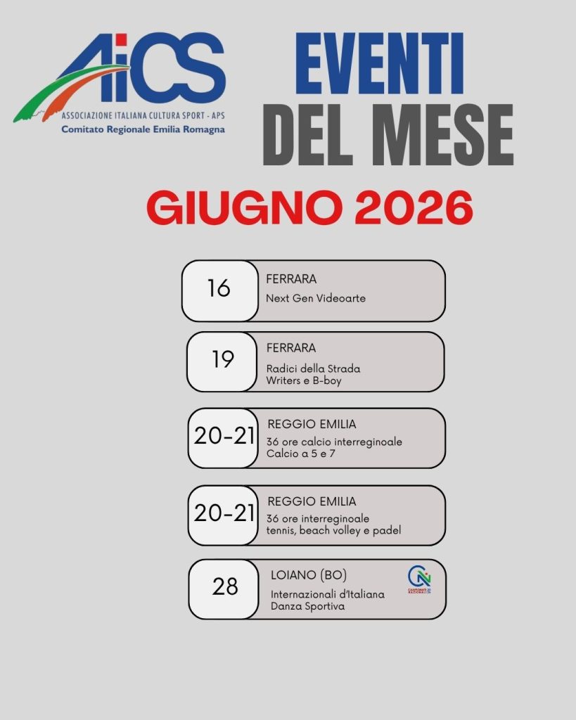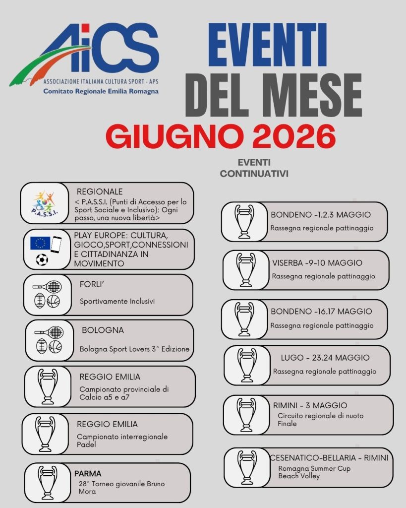 Dopo un primo quadrimestre ricco di successi, prosegue la programmazione AiCS Emilia-Romagna con la pubblicazione della seconda parte del Calendario Eventi 2026. Un nuovo capitolo fatto di iniziative che valorizzano lo sport, il territorio e la partecipazione della comunità.